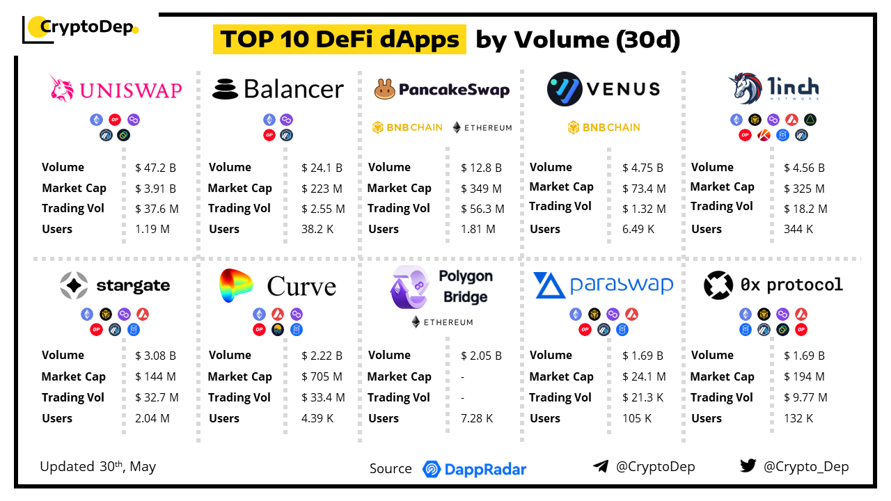 A decentralized application (dApp) is a program built on blockchain that combines a smart contract and a front-end user interface. We present the top DeFi dApps by volume in the last 30 days, regardless of the protocol's chain. Data taken from DappRadar.
