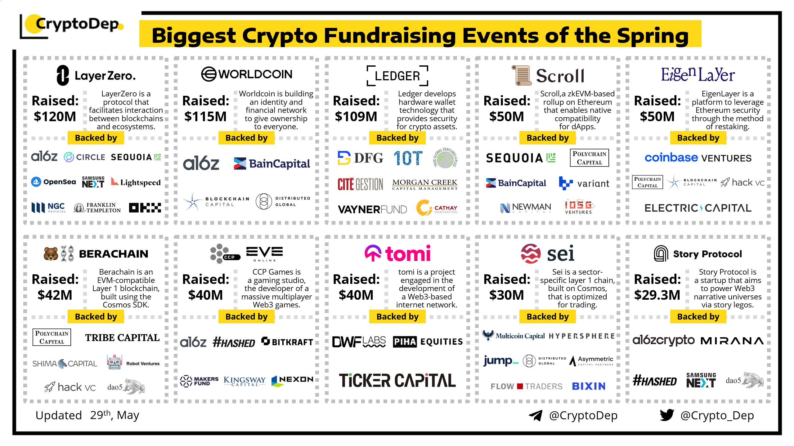 We are excited to present a list of the biggest spring crypto fundraising events, backed by well-known investors such as Sequoia Capital, a16z, Polychcain Capital, Hashed, Blockchain Capital, Coinbase Ventures, Circle Ventures, Multicoin Capital, and others. Let's take a look!