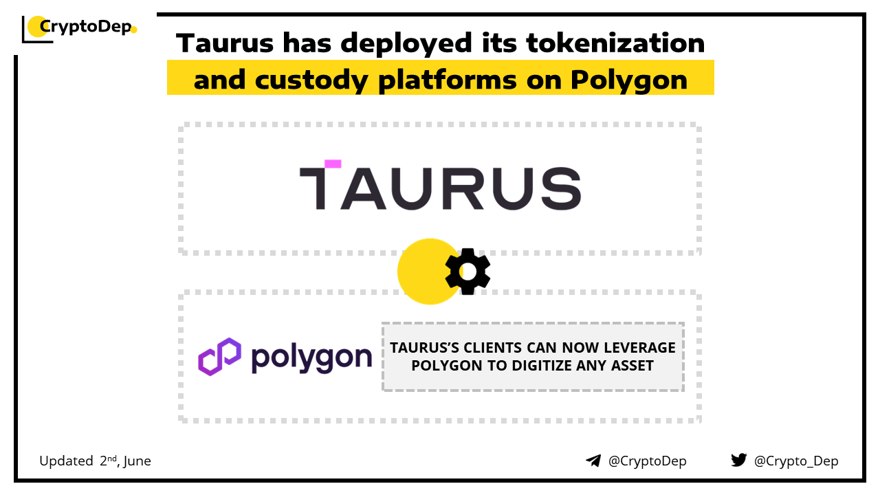 Taurus, a Swiss crypto infrastructure firm, backed by Credit Suisse and Deutsche Bank has announced the deployment of its tokenization and custody platforms on Polygon. Through this innovation, Taurus allows its clients to digitize any asset, by leveraging Polygon. Previously, the firm has raised $65M in a round led by Credit Suisse and Deutsche Bank.