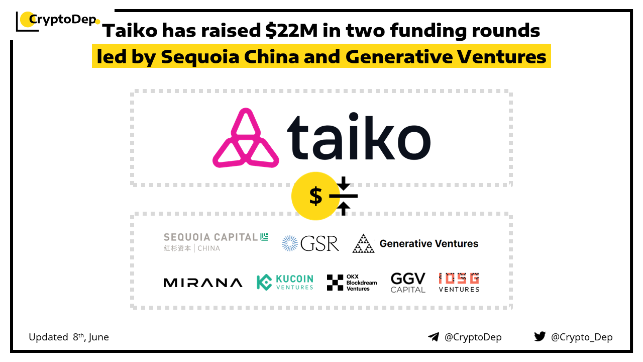 Taiko, a decentralized, Ethereum-equivalent ZK-Rollup, has closed its second funding round, bringing its total raise to $22M. The rounds were led by Sequoia China and Generative Ventures respectively, with participation from BAI Capital, GGV Capital, GSR Markets, IOSG Ventures, Kucoin Ventures, Mirana Ventures, OKX Ventures, Skyland Ventures, Token Bay Capital, Yunqi Partners, and other angel investors. The startup is building a Type 1 zkEVM, a solution touted by Vitalik Buterin as necessary for scaling the Ethereum blockchain.