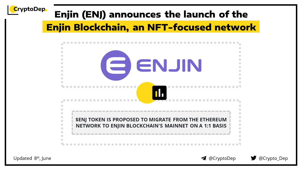 Enjin to kick off an NFT-focused blockchain with NFT transactions at the protocol level. Enjin Blockchain will not rely on smart contracts and instead will ensure that critical functions, such as creating, using, and transferring NFTs are integrated directly into the foundational code. Enjin Coin $ENJ is proposed to migrate from the Ethereum network to Enjin Blockchain's Mainnet on a 1:1 basis, and to be merged with Efinity Token $EFI, uniting the EFI and ENJ communities.