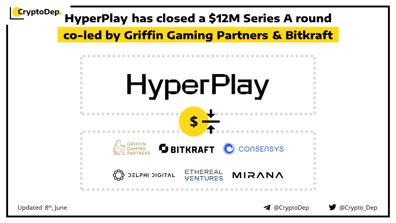 HyperPlay, a Web3-native game launcher, raised $12M in a Series A funding round co-led by Griffin Gaming Partners and Bitkraft Ventures. Other investors include MetaMaskβs parent company ConsenSys, Ethereal Ventures, Delphi Digital, Game7, Mirana Ventures, and Monoceros Ventures. HyperPlay aims to make interoperability the default for all #Web3 games through a wallet overlay on top of games.