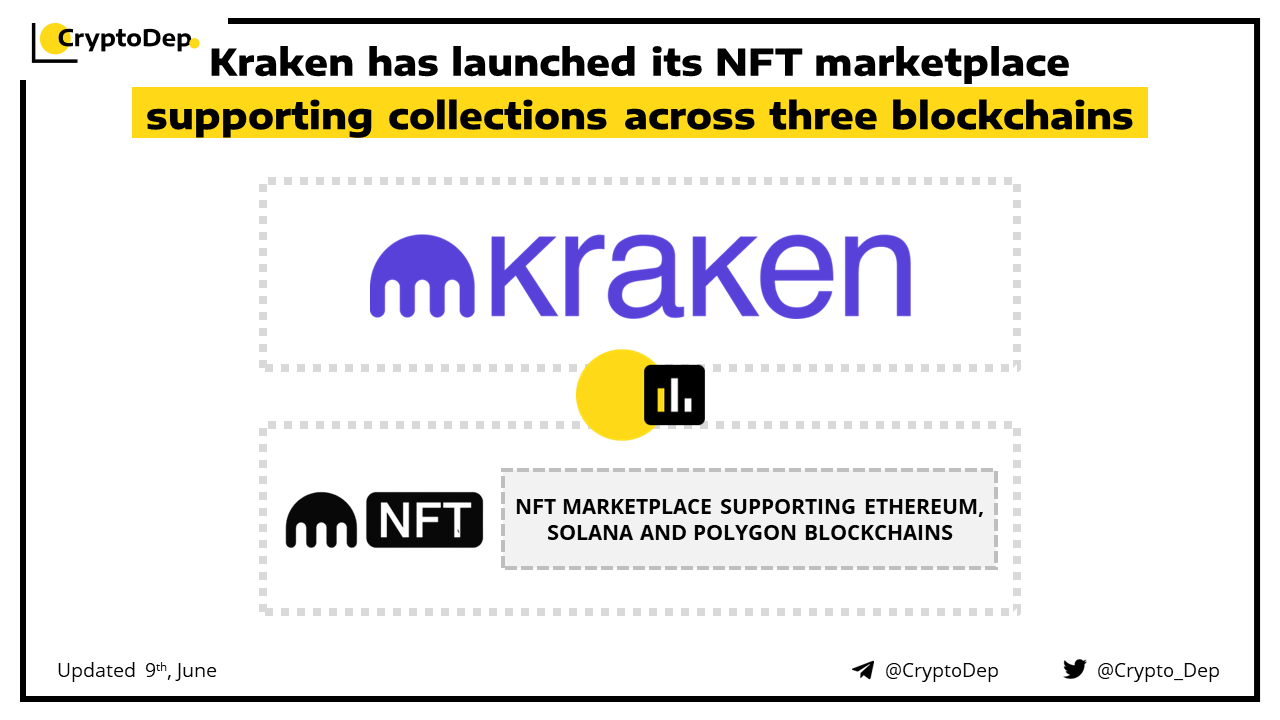 Kraken exchange has announced the launch of its NFT marketplace after the beta testing, supporting over 250 NFTs across the Ethereum, Solana, and Polygon blockchains. The marketplace will not charge gas fees to customers who buy and sell NFTs on the platform. MetaMask and Solana's Phantom wallet are currently supported with WalletConnect will be added in the future.