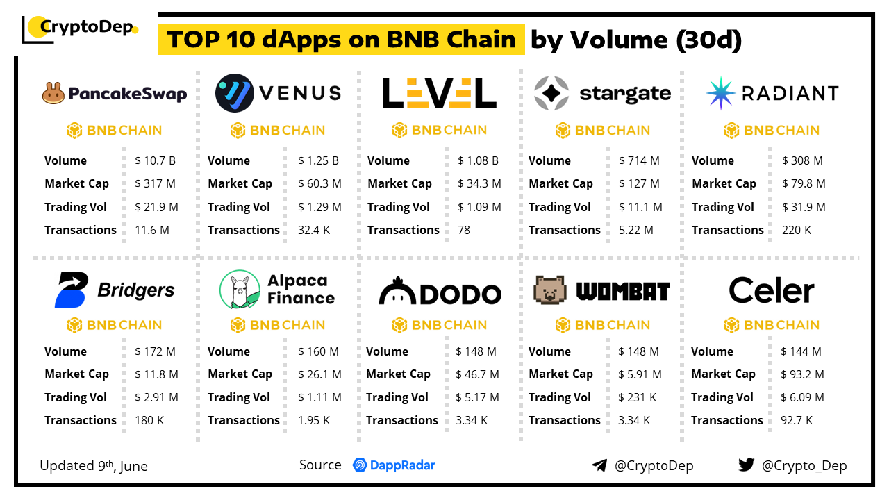 A decentralized application (dApp) is a program built on blockchain that combines a smart contract and a front-end user interface. We present the top dApps on #BNBChain by volume in the last 30 days, according to the data from DappRadar.