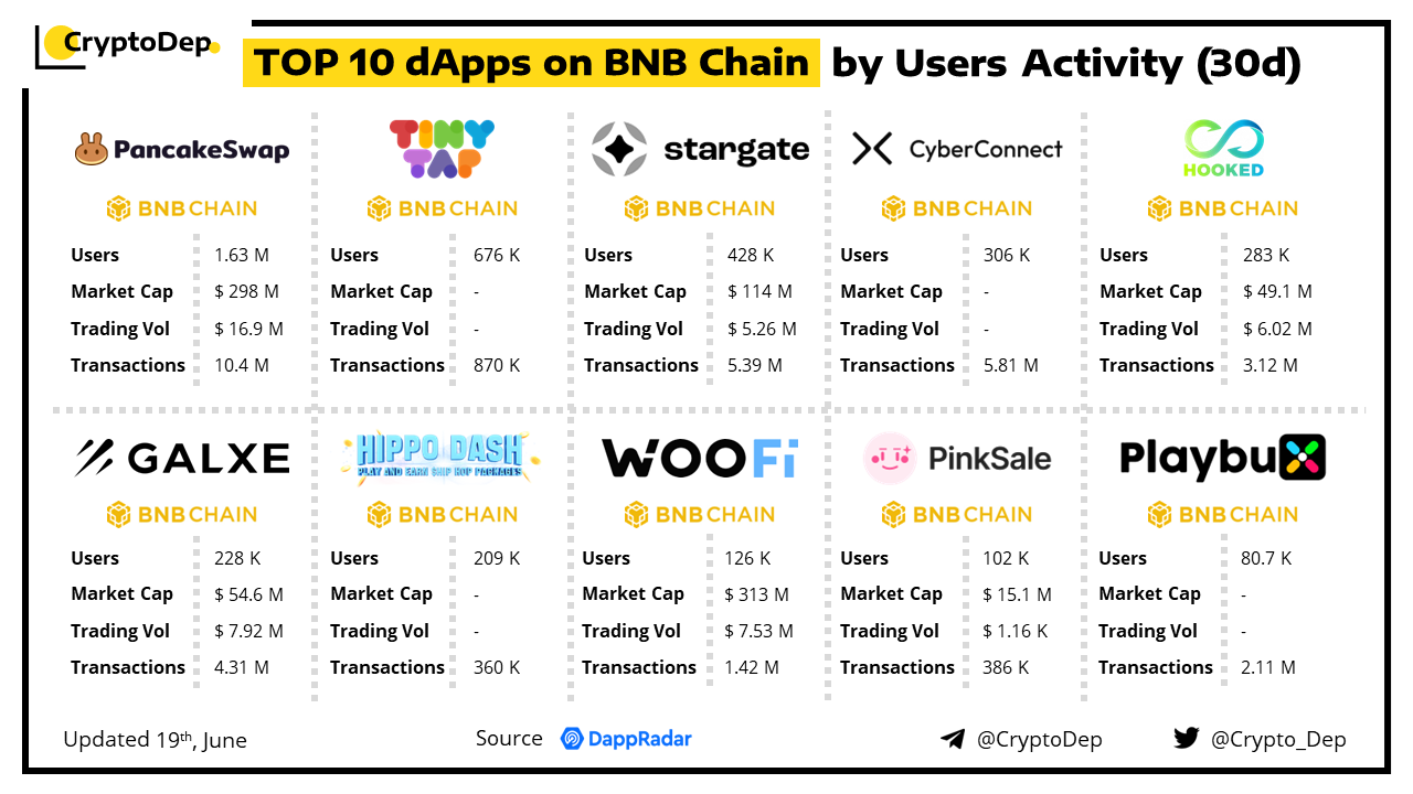 A decentralized application (dApp) is a program built on blockchain that combines a smart contract and a front-end user interface. We present the top dApps on #BNBChain by users activity in the last 30 days, according to the data from DappRadar.