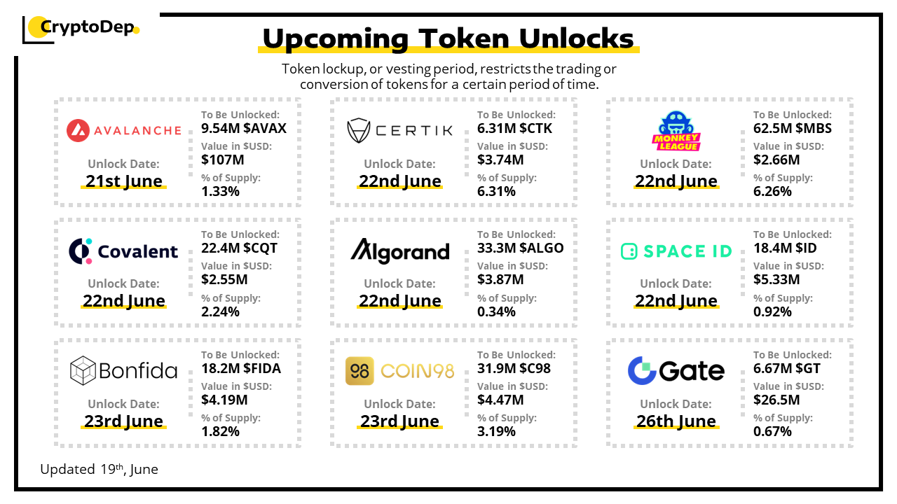 Let's take a look at the compilation of major upcoming token unlocks, diving into details such as dates, amounts, and projects related to tokens that are currently locked up, but will soon be released to the market. During this week, $AVAX, $GT, $ID, $C98, and $FIDA will have the biggest unlocks.