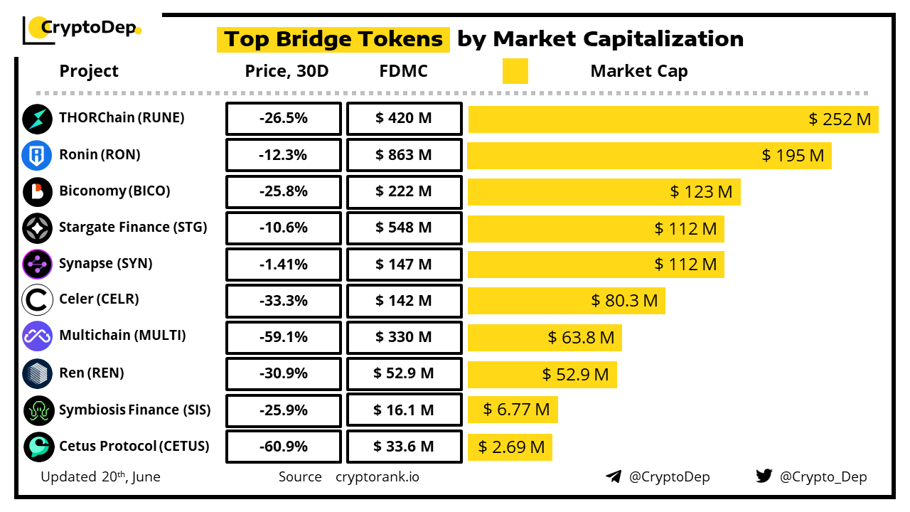 Blockchain bridges are tools that allow users to transfer digital assets and information from one blockchain to another. Let's explore the largest bridge projects by market capitalization.