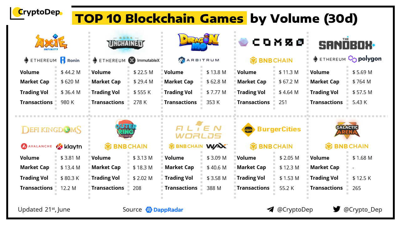 With the spread of Web3 technologies, blockchain games became the industry trend and keep on attracting the attention of gaming & crypto communities. We have made a recap of top blockchain games by volume in the last 30 days, so let's take a look!