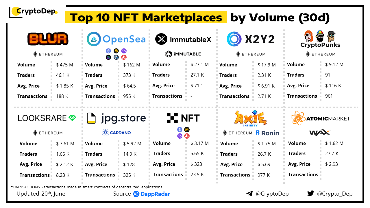 An NFT marketplace is a digital platform for buying and selling NFTs. Let's take a look at some of the best-performed NFT marketplaces by volume in the last 30 days, according to the data from DappRadar.