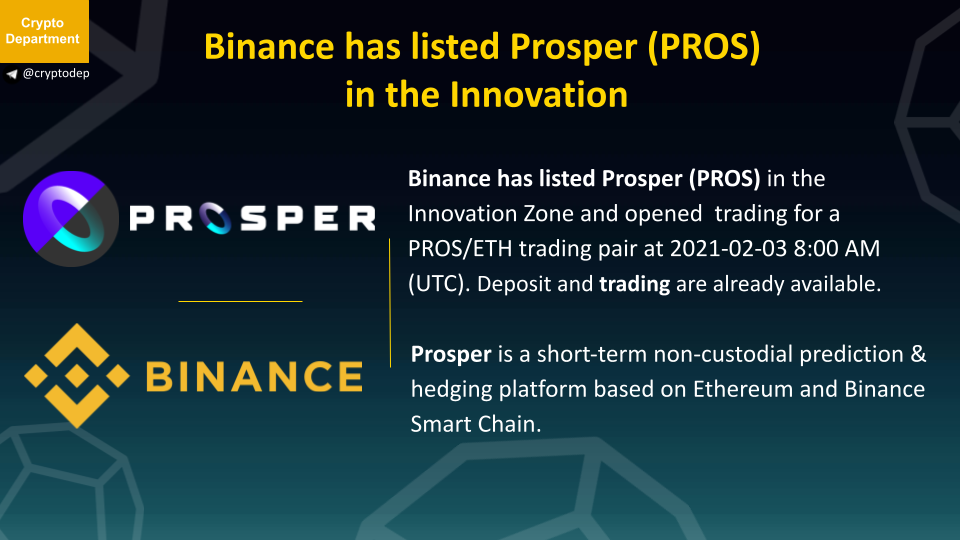 Binance has listed Prosper (PROS) in the Innovation Zone and opened trading for a PROS/ETH trading pair at 2021-02-03 8:00 AM (UTC). Deposit and trading are already available.