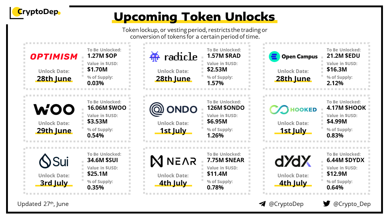 Let's take a look at the compilation of major upcoming token unlocks, diving into details such as dates, amounts, and projects related to tokens that are currently locked up, but will soon be released to the market. During this week, $SUI, $EDU, $DYDX, $NEAR, and $ONDO will have the biggest unlocks.
