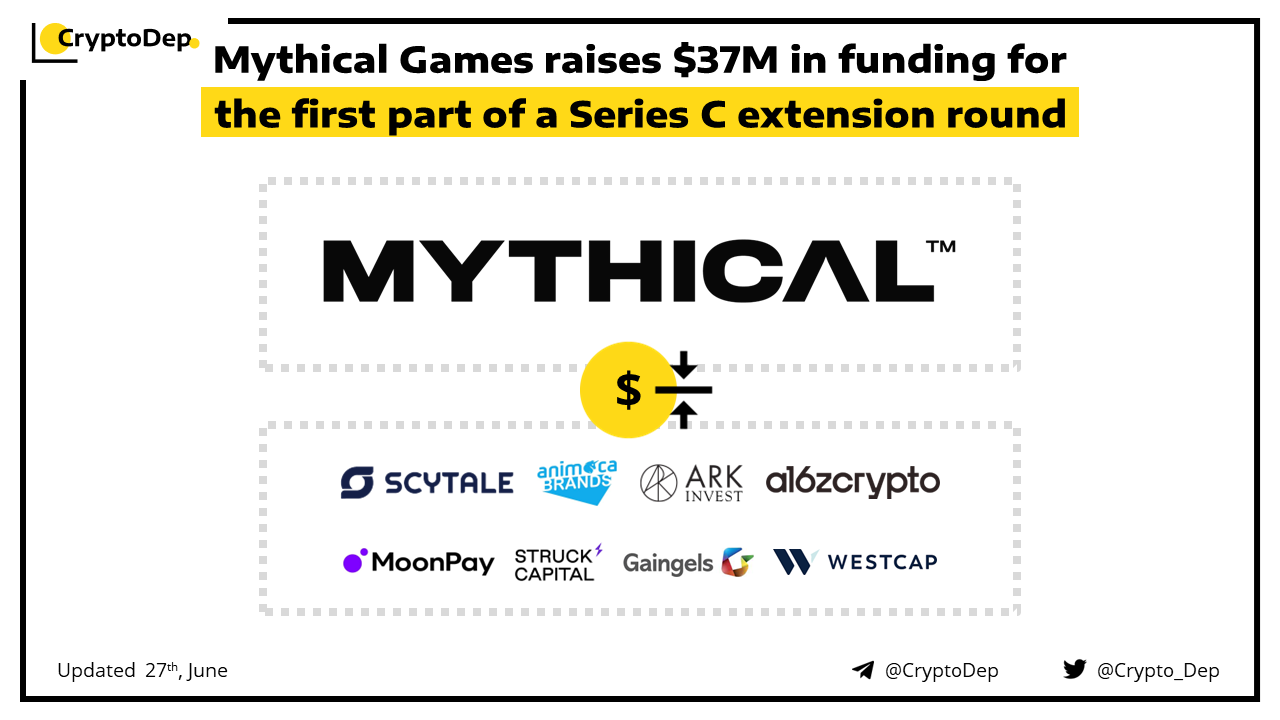 Mythical Games, a Web3 gaming studio, has secured $37M in the first part of a Series C extension round, led by Scytale Digital. Additional round participants included ARK Invest, Andreessen Horowitz, Animoca Brands, PROOF VC, Stanford Athletics, MoonPay, WestCap, Gaingels, Signum Growth, and Struck Capital. Moreover, the firm plans to close the extension round later this year and anticipates raising $20M to $30M in additional capital. Mythical Games is known for its Mythical Chain blockchain and gaming ecosystem, Mythical Marketplace and popular blockchain-based games NFL Rivals and Blankos Block Party. Back in 2021, Mythical Games raised $225M through two funding rounds from a16z, Binance Labs, FTX Ventures, and others.