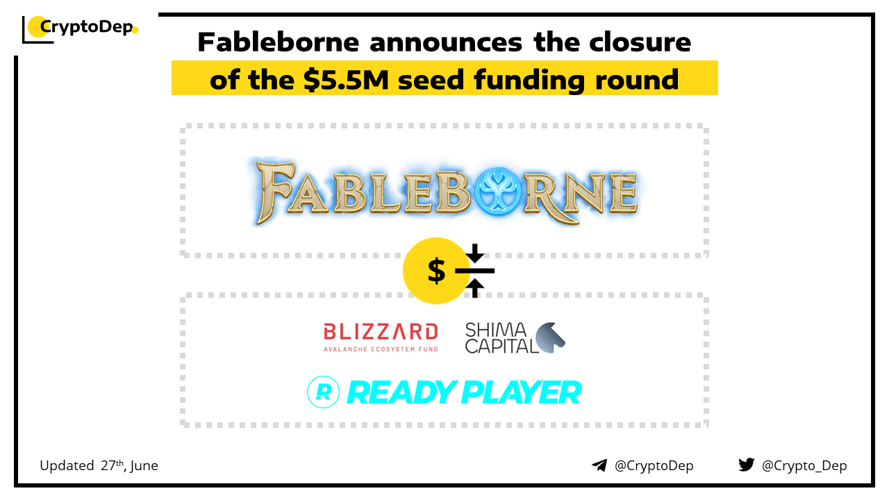Fableborne, a web3 game developed by Pixion Games, has closed its $5.5M seed investment round. Funding participants included Avalanche Foundationβs Blizzard Fund, Shima Capital, and ReadyPlayerDAO among others. Fableborne is the action-based role-playing game that allows players to interact with on-chain assets built atop the Avalanche network.