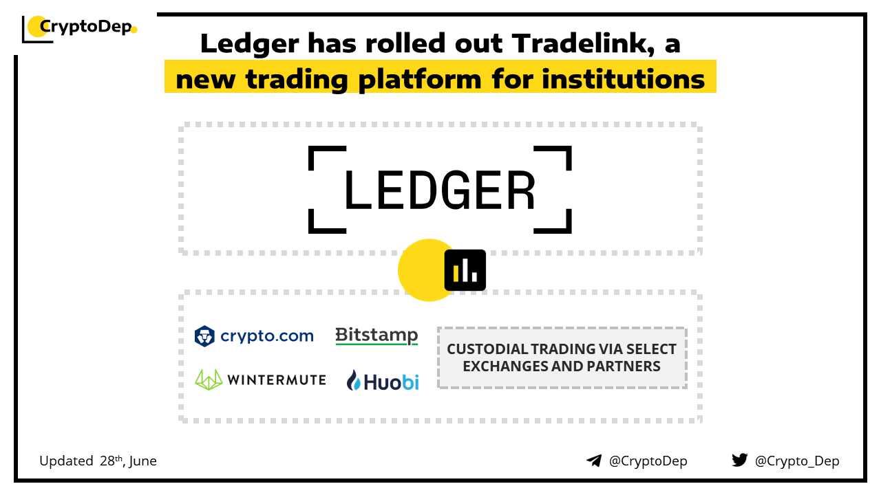 Ledger crypto security firm has announced the launch of Tradelink, a new trading platform for institutions. The platform will enable custodial trading via select exchanges and custodial partners. Numerous partners will support the exchange at launch, including asset managers, custodians, exchanges and other kinds of brokers including CrΡptΠΎ.ΡΠΎm, Bitstamp, Huobi, Uphold Institutional, Wintermute, and others.