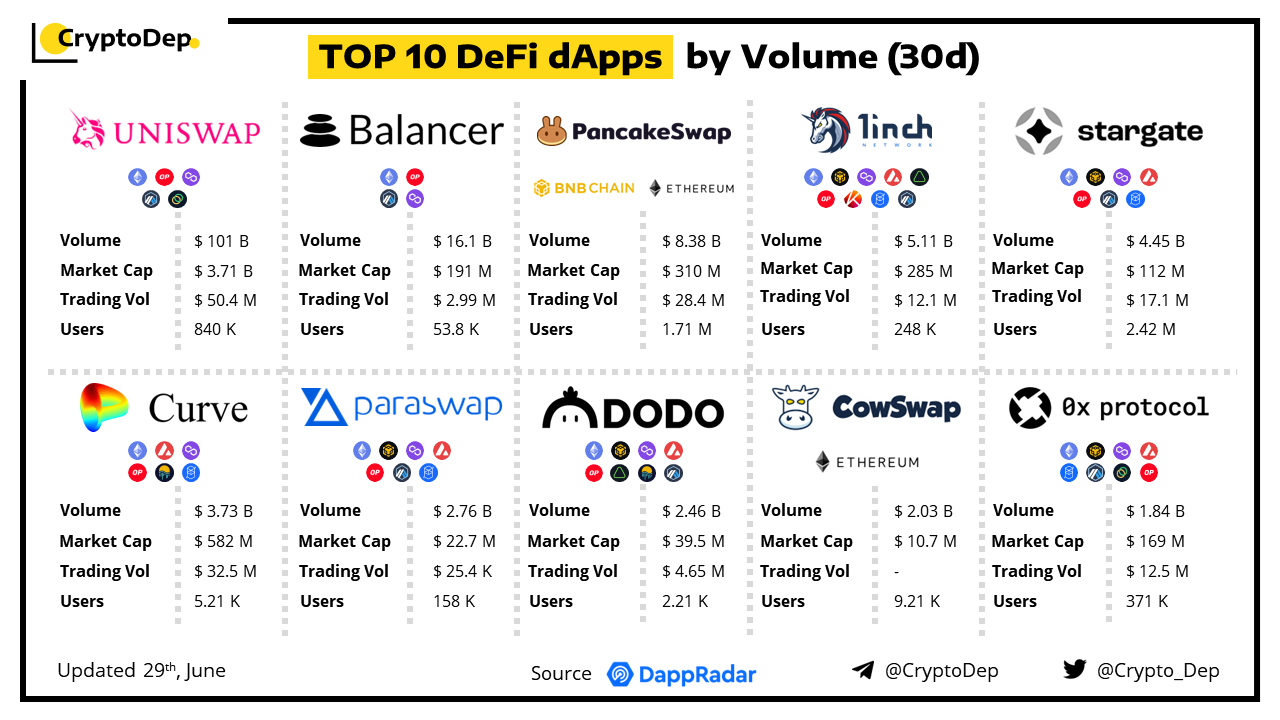 A decentralized application (dApp) is a program built on blockchain that combines a smart contract and a front-end user interface. We present the top DeFi dApps by volume in the last 30 days, regardless of the protocol's chain. Data taken from DappRadar.