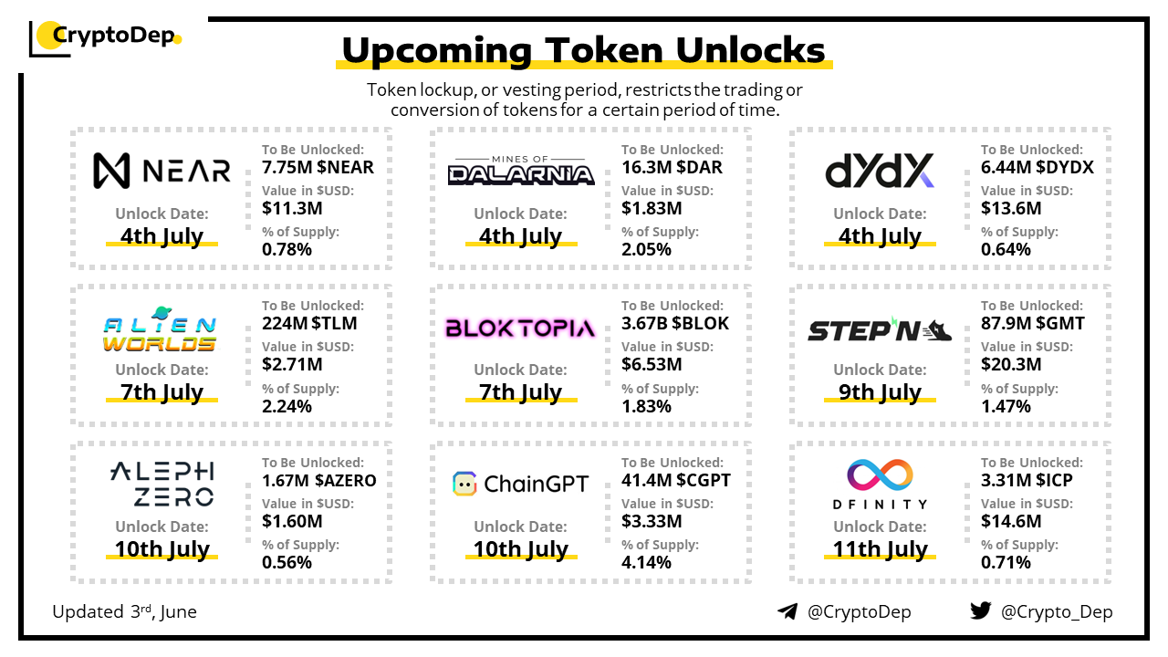 Let's take a look at the compilation of major upcoming token unlocks, diving into details such as dates, amounts, and projects related to tokens that are currently locked up, but will soon be released to the market. During this week, $GMT, $ICP, $DYDX, $NEAR, and $BLOK will have the biggest unlocks.