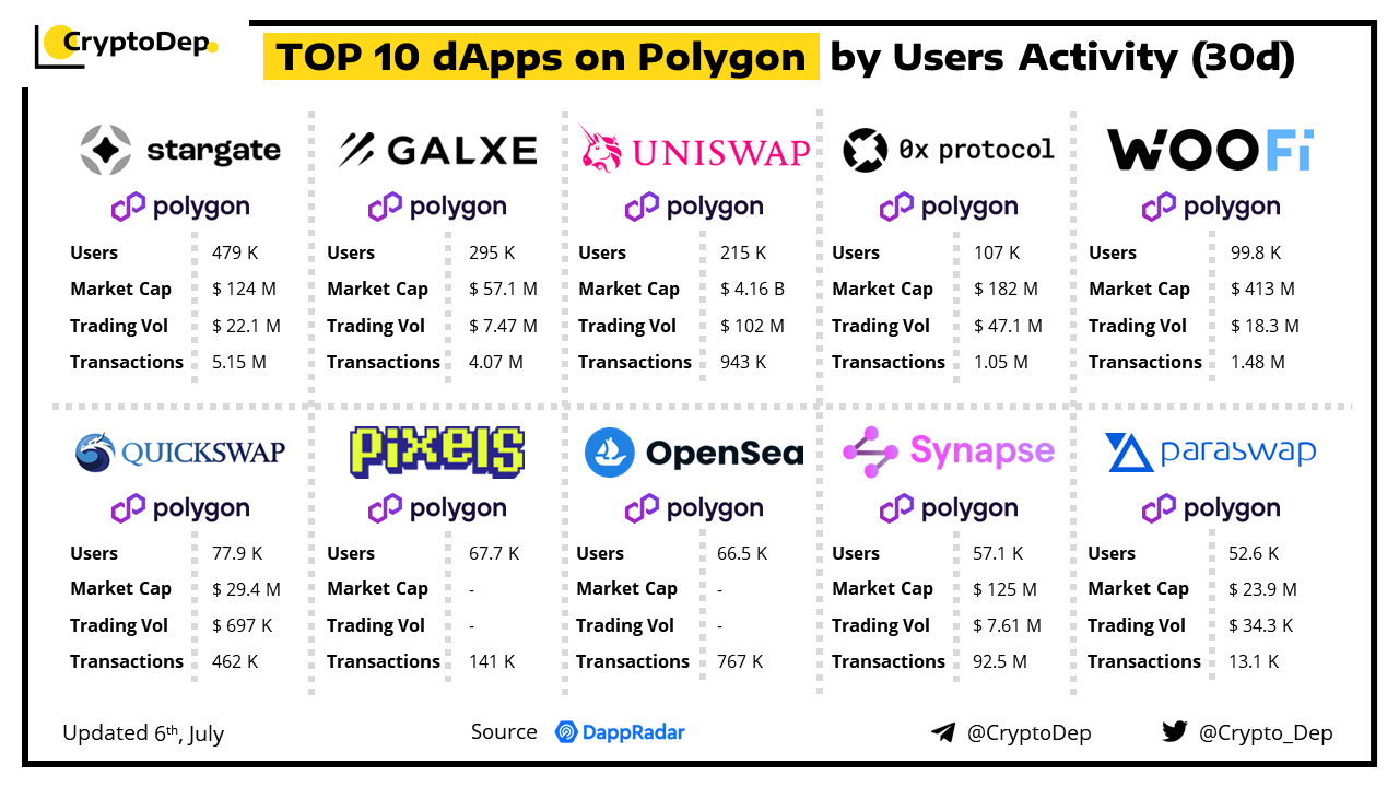 A decentralized application (dApp) is a program built on blockchain that combines a smart contract and a front-end user interface. We present the top dApps on #Polygon by users activity in the last 30 days, according to the data from DappRadar.