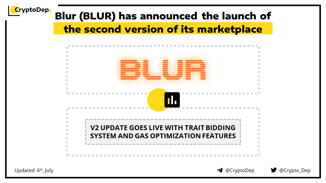 Blur, an NFT marketplace, has introduced its V2 upgrade with a trait bidding system and gas optimization features. With the launch of the V2 upgrade, trading on Blur will cost 50% less in gas, and bidding points have been updated to incorporate trait bids. Blur.ัะพ is an NFT marketplace designed for pro traders, backed by Paradigm.