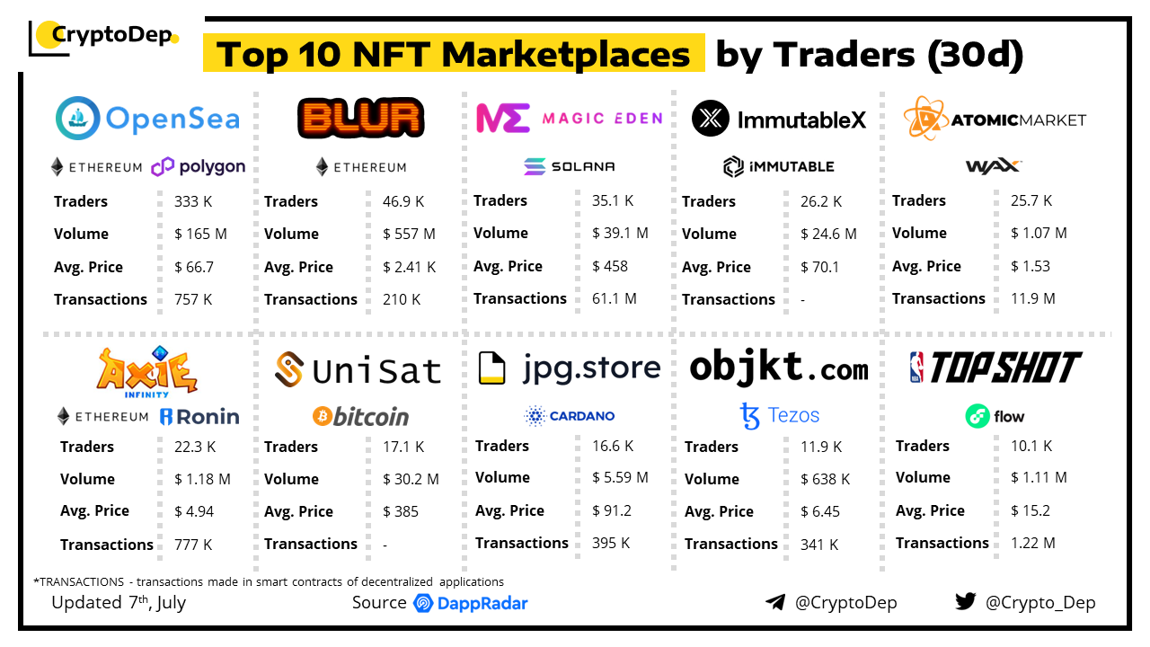 An NFT marketplace is a digital platform for buying and selling NFTs. Let's take a look at some of the best-performed NFT marketplaces by the number of traders in the last 30 days, according to the data from DappRadar.