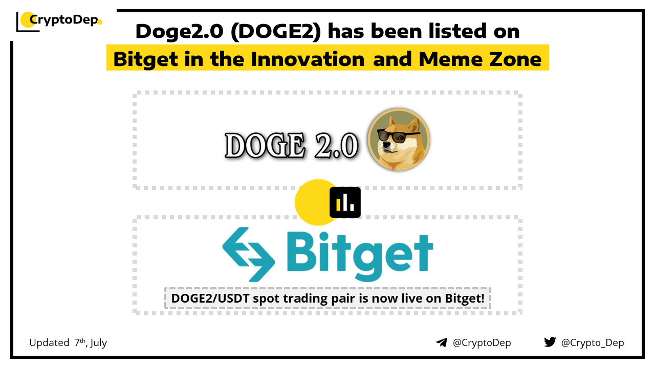 $DOGE2 token is now available for trading in the Innovation and Meme zone on Bitget! Deposits are now open and withdrawals will open on July 8th, at 8:00 AM UTC. $DOGE2.0 is a meme token that's designed to offer a fair and transparent experience to its holders.