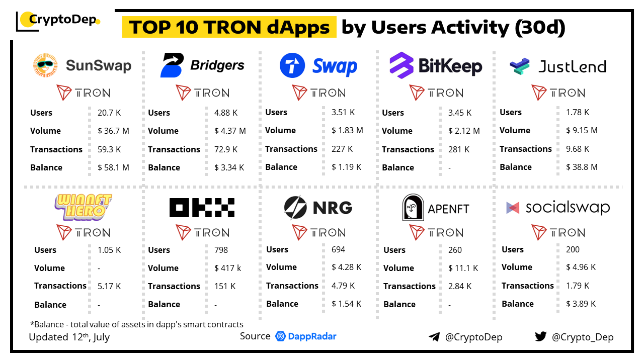 A decentralized application (dApp) is a program built on blockchain that combines a smart contract and a front-end user interface. We present the top dApps on #Tron by users activity in the last 30 days, according to the data from DappRadar.
