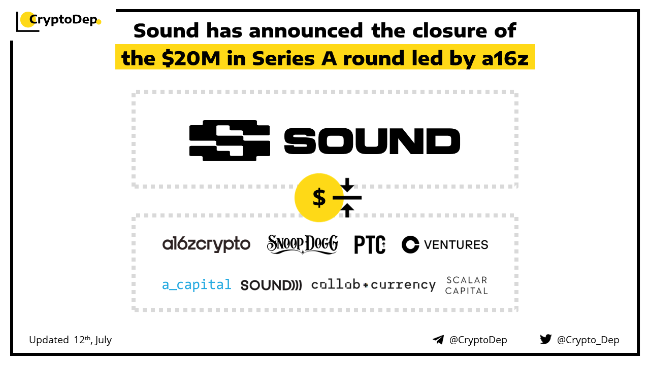 Sound, a Web3 music firm, has raised $20M in the Series A investment led by a16z. Additional round participants included Palm Tree Crew, A Capital, Sound Ventures, Collab + Currency, Scalar Capital, Snoop Dogg, Ryan Tedder, and Tay Keith. The funds will be used to expand its artist relations, engineering, and marketing teams.