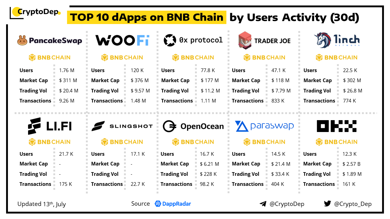 A decentralized application (dApp) is a program built on blockchain that combines a smart contract and a front-end user interface. We present the top dApps on #BNBChain by users activity in the last 30 days, according to the data from DappRadar.