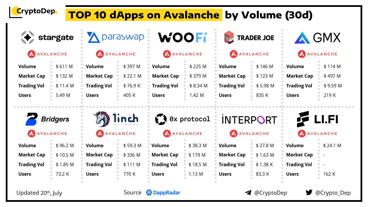 A decentralized application (dApp) is a program built on blockchain that combines a smart contract and a front-end user interface. We present the top dApps on #Avalanche by volume in the last 30 days, according to the data from DappRadar.