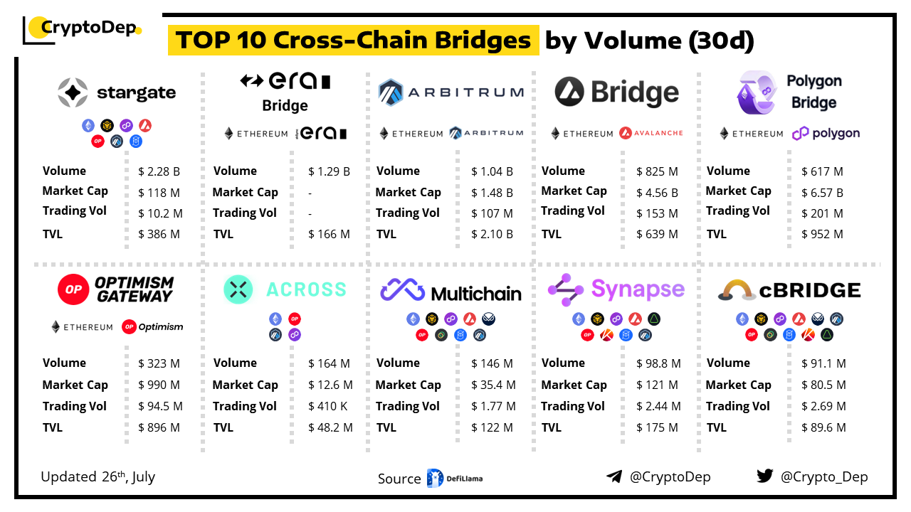 Cross-chain bridges are software applications that enable transactions to occur between various blockchains. We present the top cross-chain bridges by volume in the last 30 days, according to the data from DefiLlama.