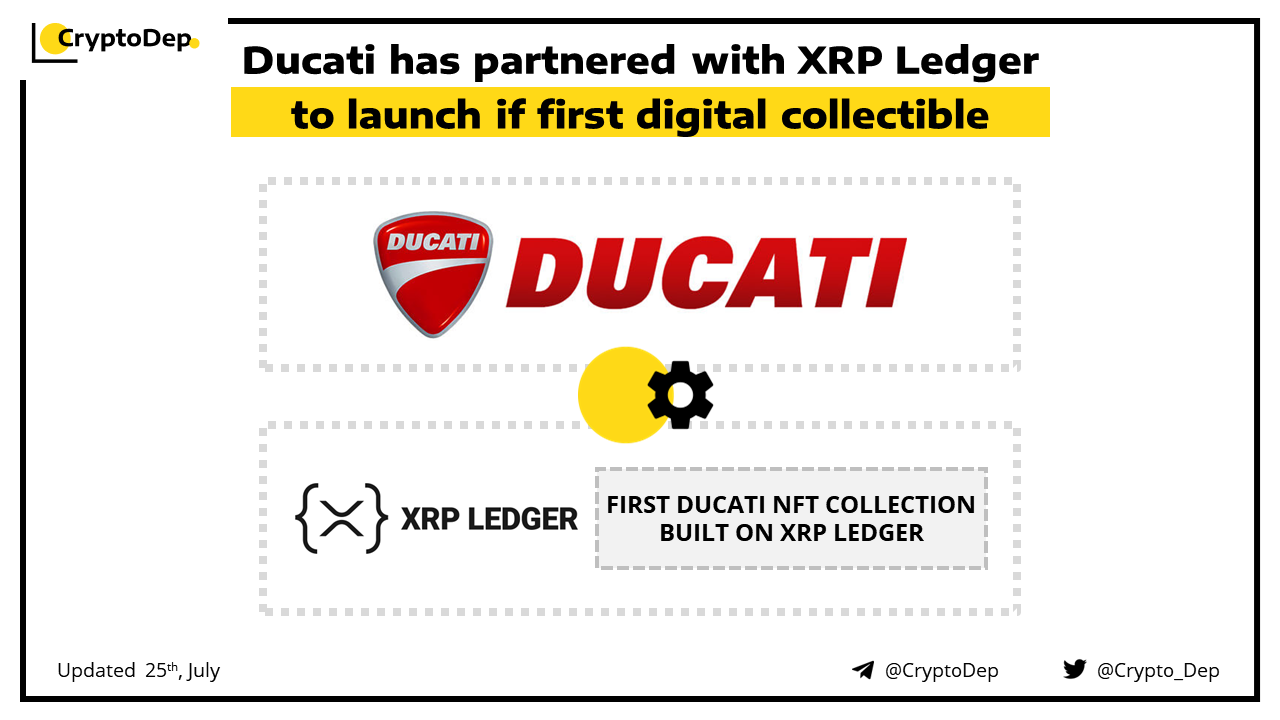 Ducati motorcycle manufacturer will launch its NFT collection on July 26th, built in partnership with XRP Ledger. The collection will consist of a video sequence of Ducati logos on tanks of motorcycles produced since 1946. Moreover, users who receive the first collectible will also gain access to subsequent project releases.