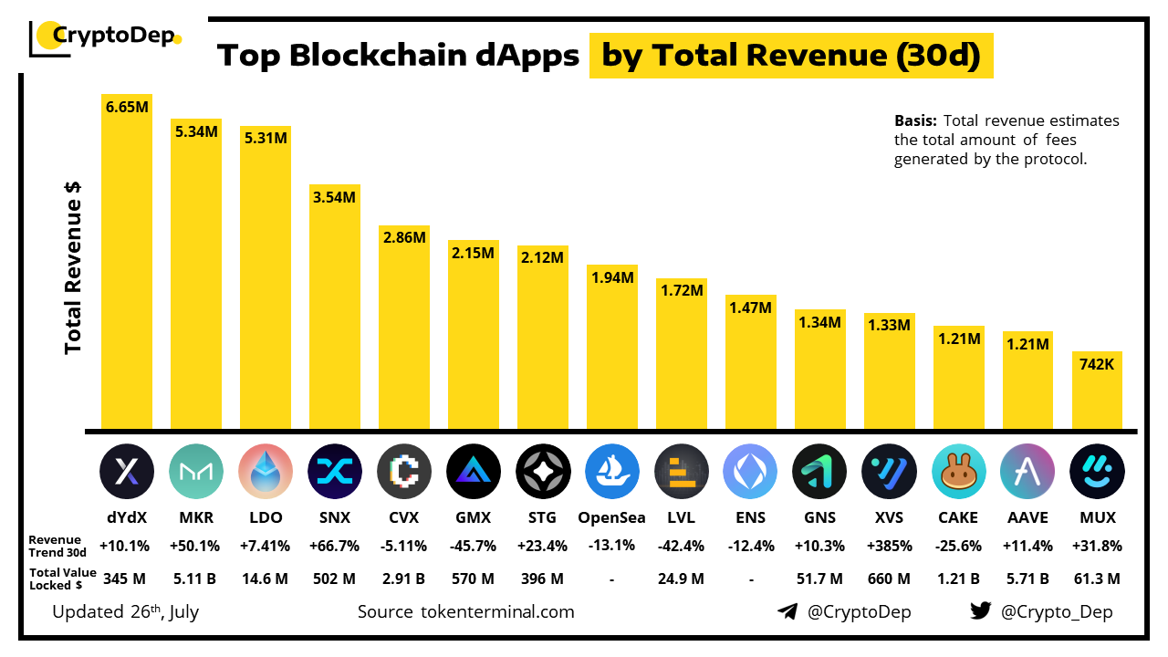 Decentralized applications (dApps) operate on a blockchain network and have gained popularity in recent years. In this post, we analyze the data from Token Terminal and rank the top blockchain dApps by total revenue in the last 30 days, to understand which dApps are generating the most income and why.