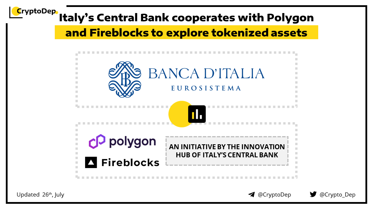 Italyβs Central Bank has teamed up with Polygon and Fireblocks on the new initiative that aims to help Italian banks, asset managers, and financial institutions to experiment with decentralized finance and security tokens. This move follows the central bank's work on CBDC and blockchain technology application into the existing payment system.