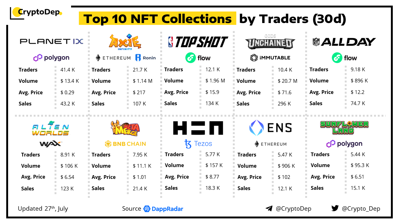 In this post, we analyze top NFT collections by the number of traders in the last 30 days, according to the data from DappRadar. Let's take a look!