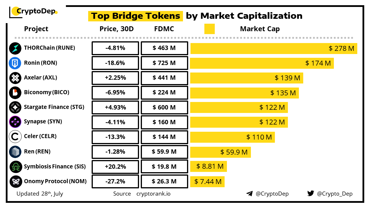 Blockchain bridges are tools that allow users to transfer digital assets and information from one blockchain to another. Let's explore the largest bridge projects by market capitalization.