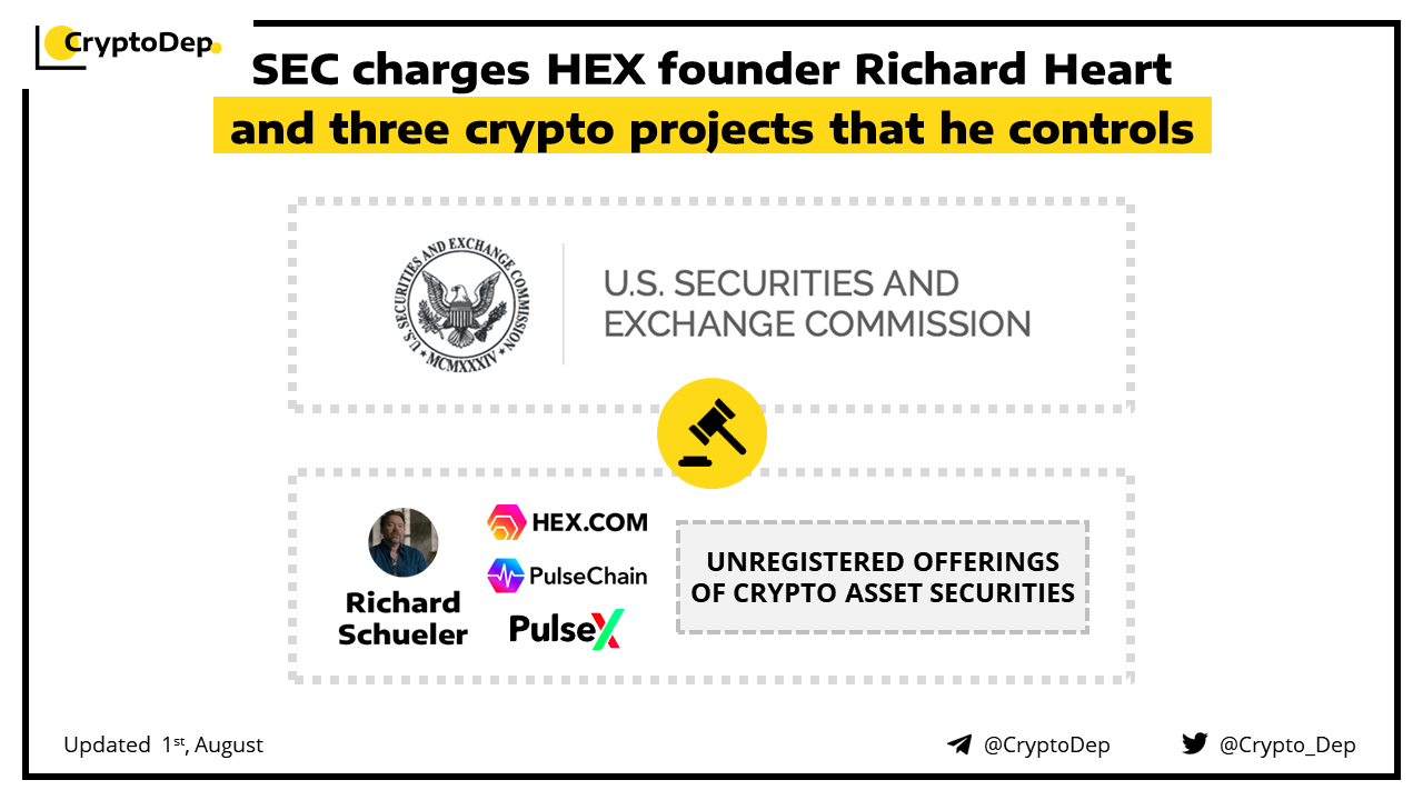 The Securities and Exchange Commission has charged Richard Heart (Richard Schueler) and three unincorporated entities that he controls, Hex, PulseChain, and PulseX, with conducting unregistered offerings of crypto asset securities that raised more than $1B in crypto assets from investors. Moreover, The SEC also charged Heart and PulseChain with fraud for misappropriating at least $12M of offering proceeds to purchase luxury goods including sports cars, watches, and a 555-carat black diamond known as βThe Enigmaβ β reportedly the largest black diamond in the world.