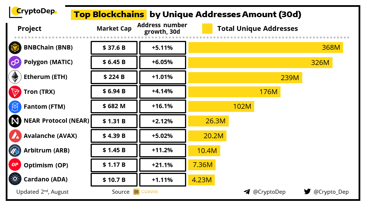 Let's take a look at the list of the most widely used blockchain networks based on the number of unique addresses associated with each platform over the past 30 days. BNB Chain, Polygon, Ethereum, Tron, and Fantom remain the networks with the largest number of unique users.