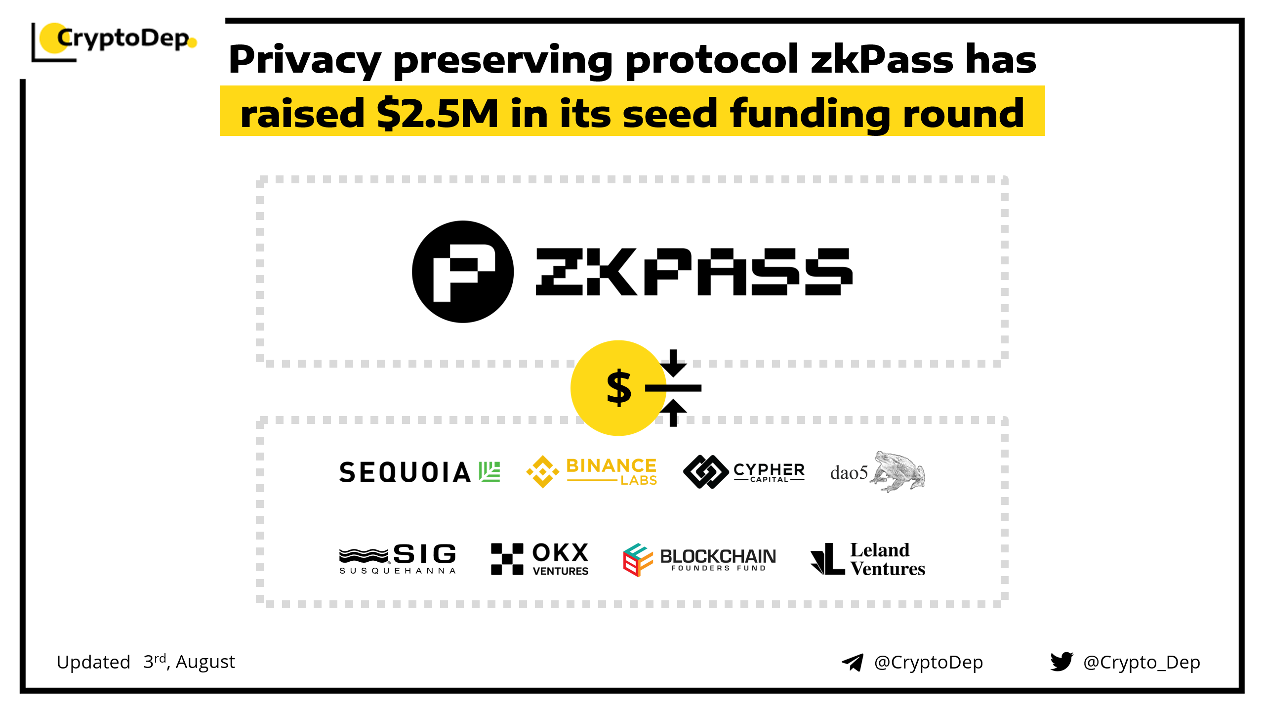 zkPass has announced the closure of a $2.5M seed round backed by Binance Labs, Sequoia China, OKX Ventures, dao5, Susquehanna International Group, Cypher Capital, Leland Ventures and Blockchain Founders Fund. The funding will support development of its pre-alpha testnet, which has 190K signups on its waitlist (still open for signup). zkPass is composable, privacy-preserving decentralized identity verification solution for Web3, incubated by Binance Labs.