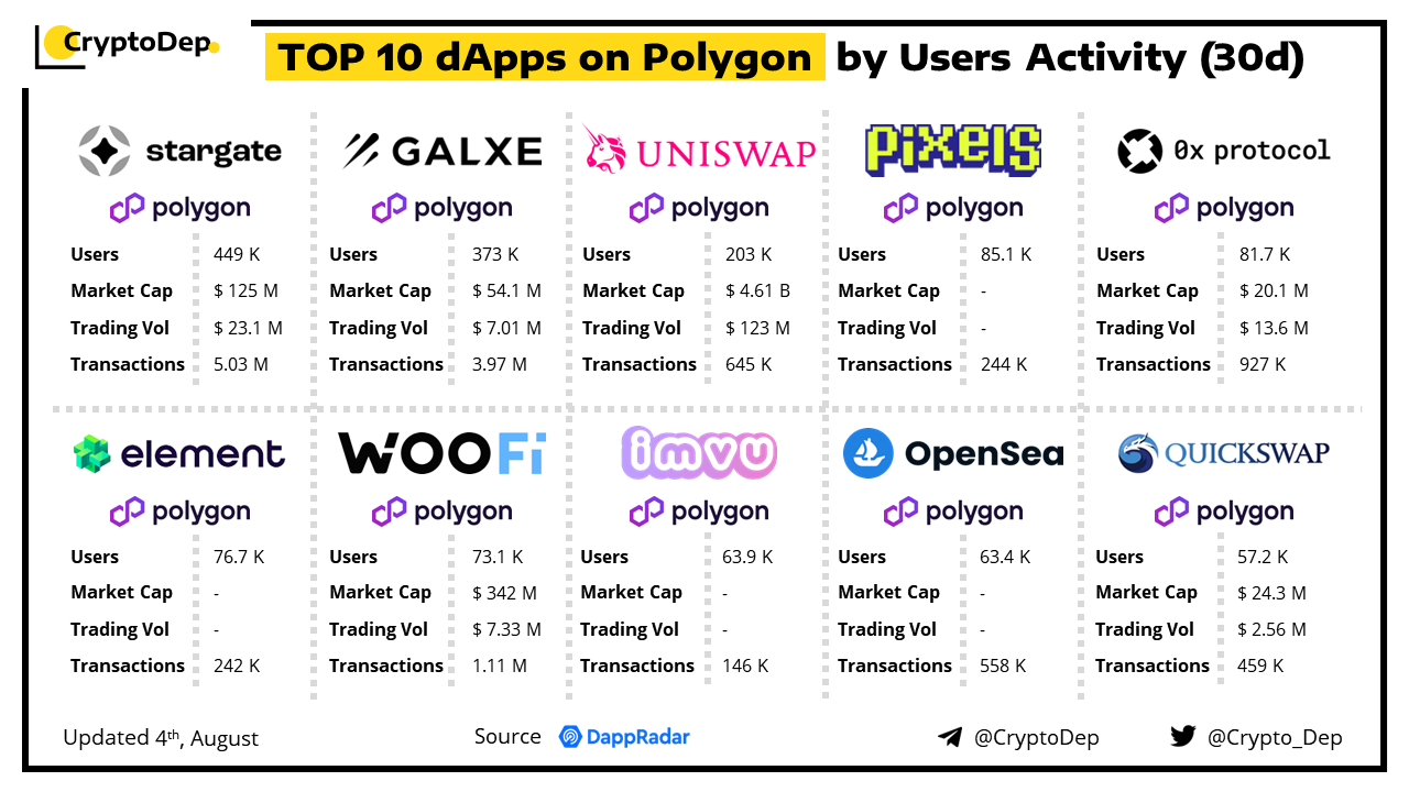 A decentralized application (dApp) is a program built on blockchain that combines a smart contract and a front-end user interface. We present the top dApps on #Polygon by users activity in the last 30 days, according to the data from DappRadar.