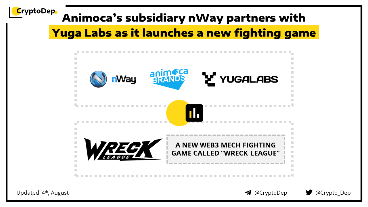 nWay, an Animoca subsidiary, has launched a new web3 mech fighting game called Wreck League. The firm has also entered into an agreement with Yuga Labs that will allow it to utilize not only Bored Apes IP but also that of Mutant Ape Yacht Club, Bored Ape Kennel Club, and Otherside Kodas. Users can now interact with the game by applying the allowlist that requires KYC verification.