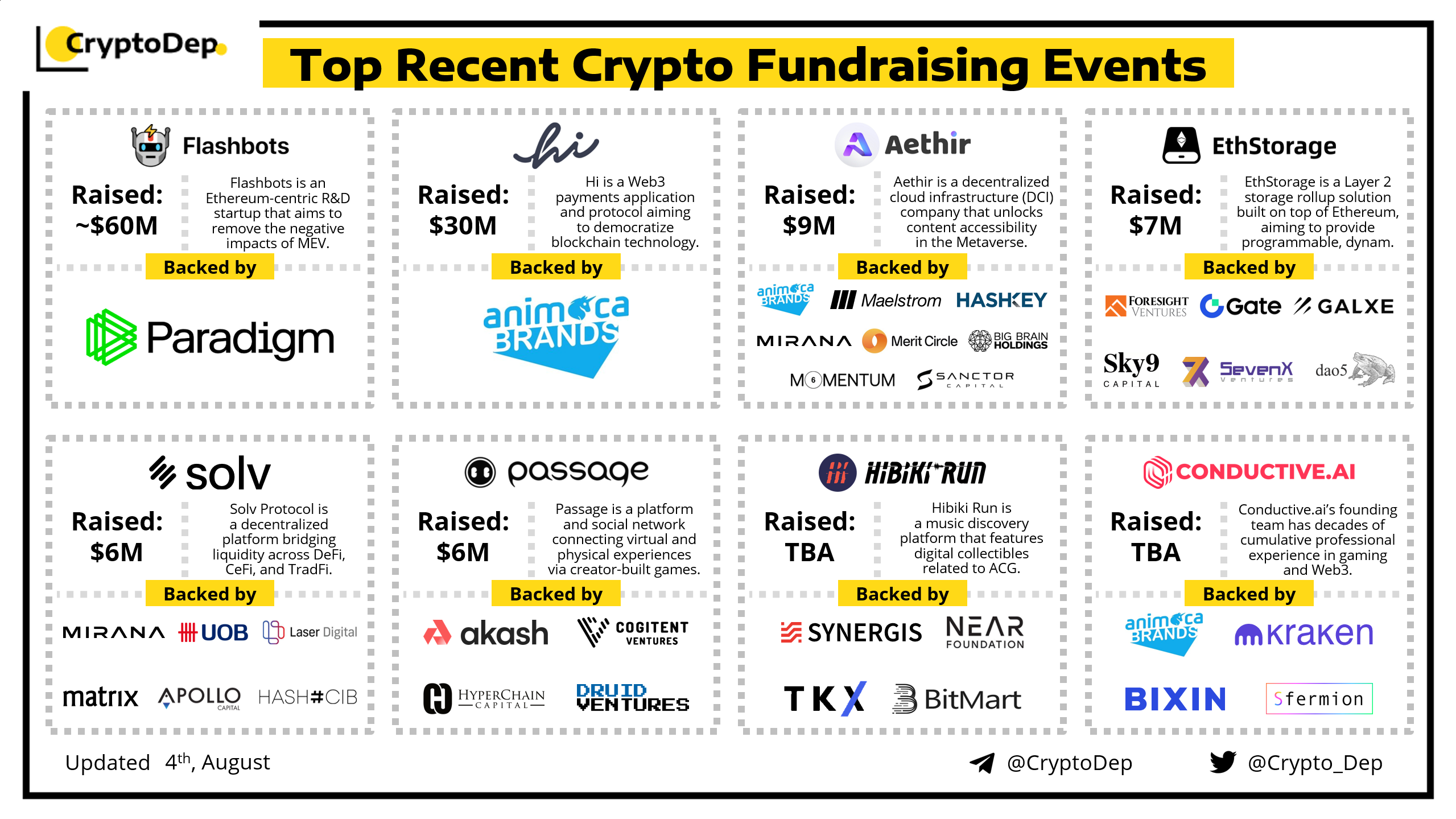 We are excited to present a list of some recent crypto fundraising events, backed by well-known investors such as Paradigm, Animoca Brands, Hashkey, Mirana, Big Brain Holdings, Maelstrom, Near Foundation, Galxe, Akash Network, Kraken Ventures, Gate Ventures, and others. Let's take a look!