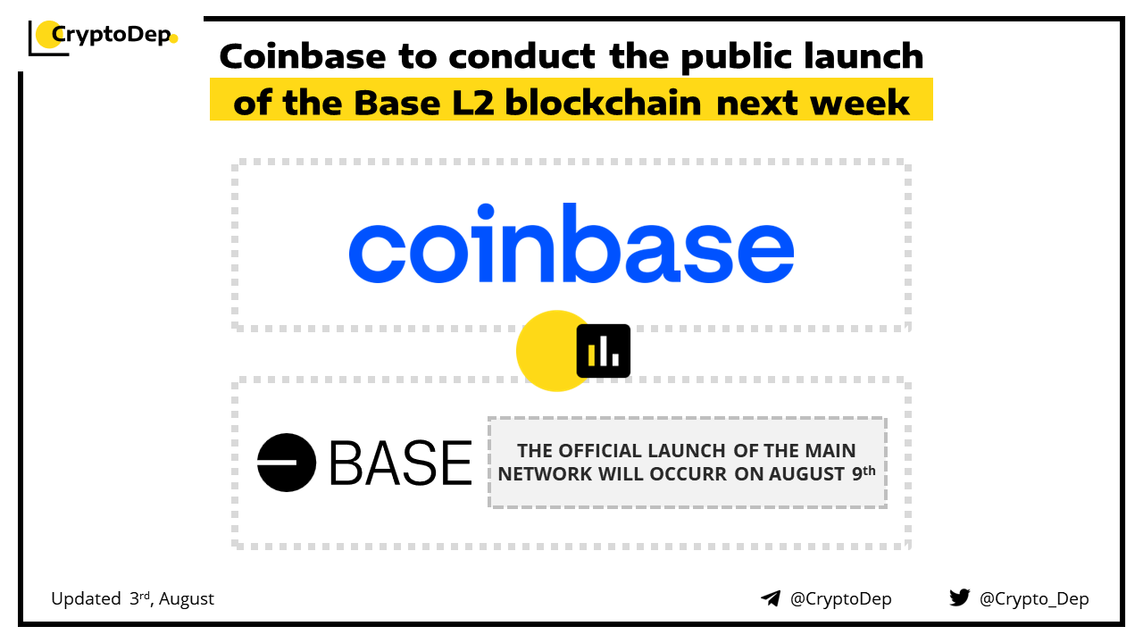 Coinbase exchange will launch its OP Stack-based Base Layer 2 blockchain on August 9th. Starting from Thursday, users will be able to bridge their $ETH to Base, with the official launch of the main network planned for August 9th. Base went live for developers in July with several tools available, including node providers, block explorers, and data indexers.