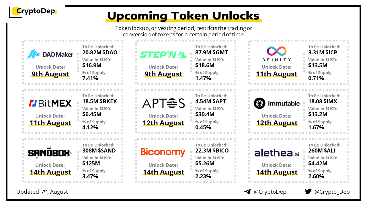 Let's take a look at the compilation of major upcoming token unlocks, diving into details such as dates, amounts, and projects related to tokens that are currently locked up, but will soon be released to the market. During this week, $SAND, $APT, $GMT, $DAO, and $ICP will have the biggest unlocks.