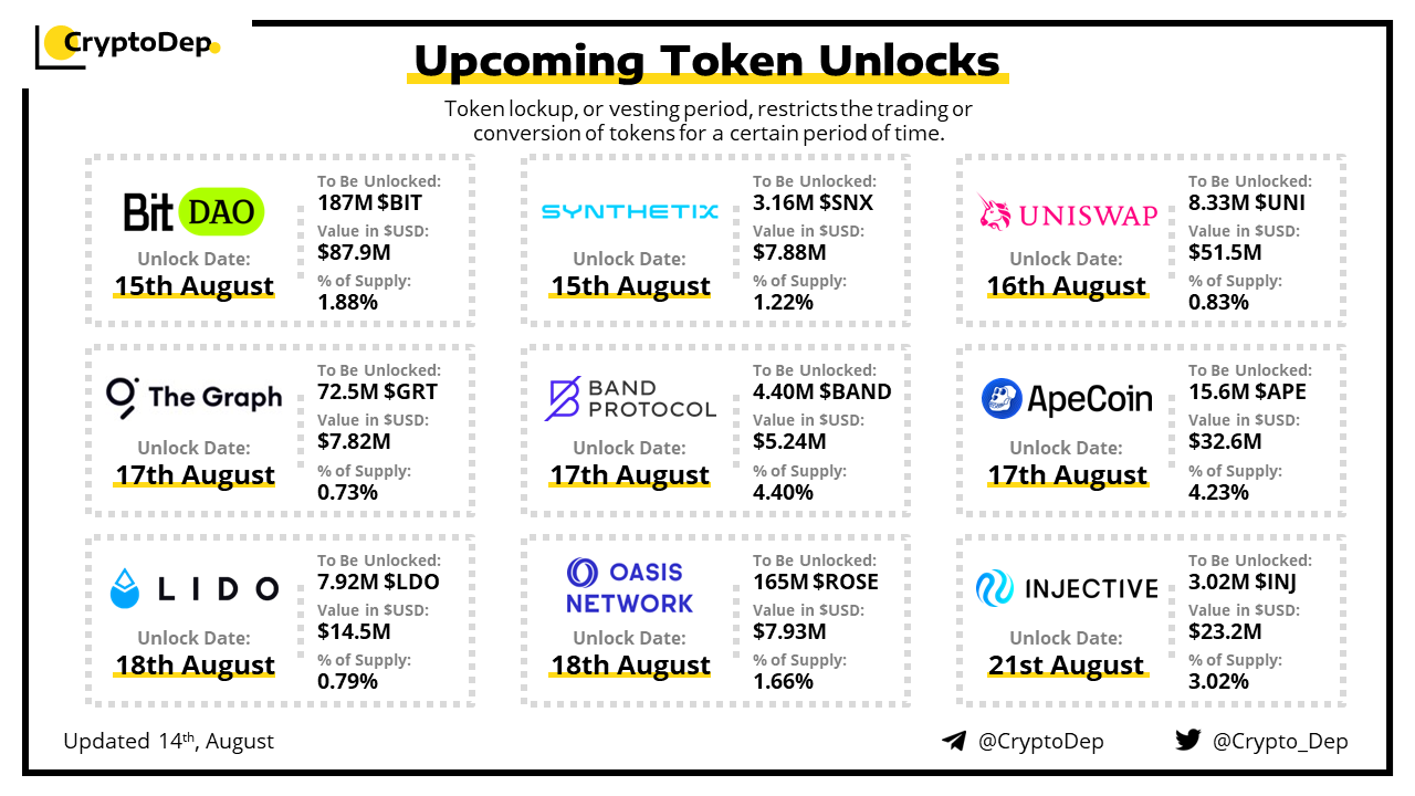 Let's take a look at the compilation of major upcoming token unlocks, diving into details such as dates, amounts, and projects related to tokens that are currently locked up, but will soon be released to the market. During this week, $BIT, $UNI, $APE, $INJ, and $LDO will have the biggest unlocks.