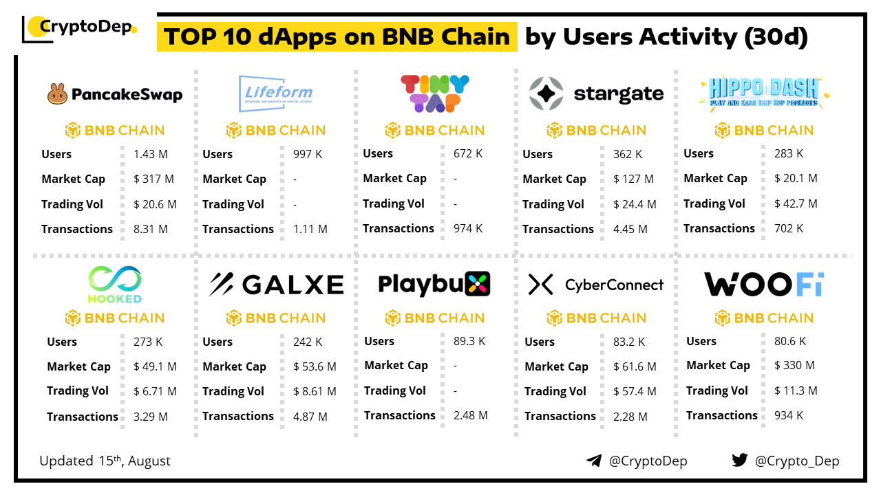 A decentralized application (dApp) is a program built on blockchain that combines a smart contract and a front-end user interface. We present the top dApps on #BNBChain by users activity in the last 30 days, according to the data from DappRadar.