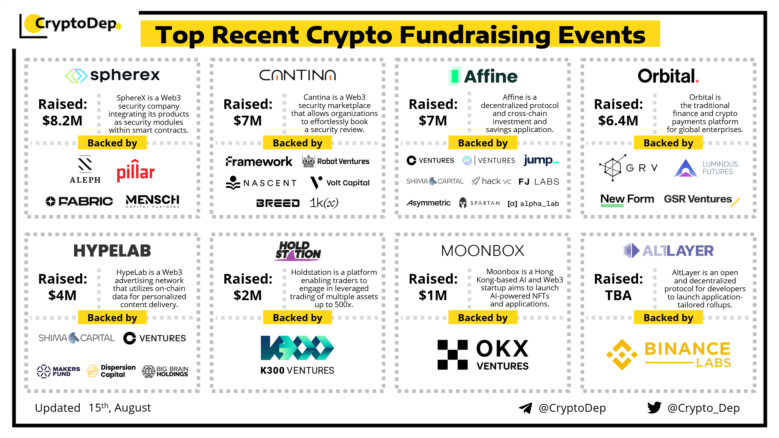 We are excited to present a list of some recent crypto fundraising events, backed by well-known investors such as Binance Labs. Coinbase Ventures, Circle Ventures, Shima Capital, Jump Crypto, Robot Ventures, Framework Ventures, Spartan, Fabric Ventures, OKX Ventures, and others. Let's take a look!