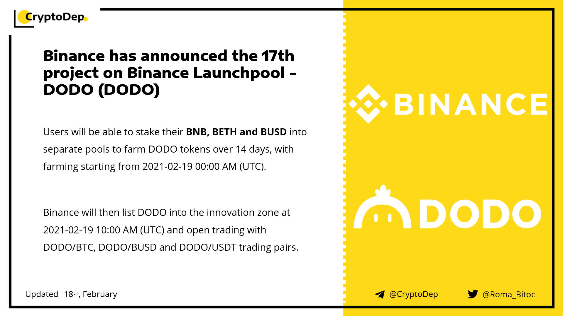 Binance will then list DODO into the innovation zone at 2021-02-19 10:00 AM (UTC) and open trading with DODO/BTC, DODO/BUSD and DODO/USDT trading pairs.