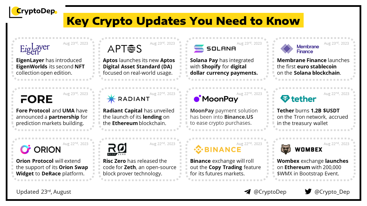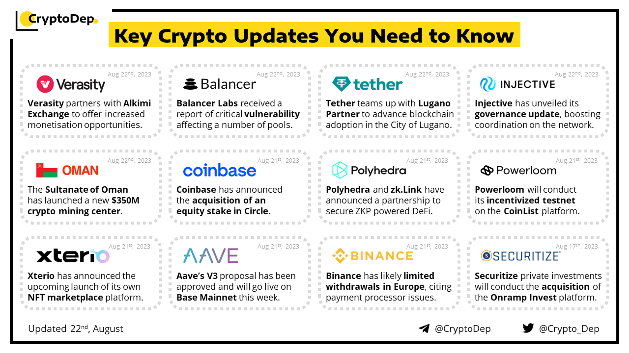 Circle has announced the expansion of the $USDC support to six new blockchains. New networks that will now support $USDC stablecoin include Polygon PoS, Base, Polkadot, NEAR, Optimism, and Cosmos, the transition is facilitated via the Noble network. Moreover, Coinbase exchange yesterday undisclosed its acquisition of an equity stake in Circle.