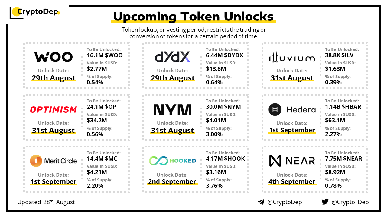 Let's take a look at the compilation of major upcoming token unlocks, diving into details such as dates, amounts, and projects related to tokens that are currently locked up, but will soon be released to the market. During this week, $HBAR, $OP, $DYDX, $NEAR, and $MC will have the biggest unlocks.