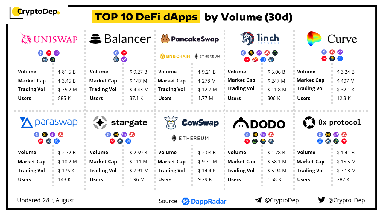 A decentralized application (dApp) is a program built on blockchain that combines a smart contract and a front-end user interface. We present the top DeFi dApps by volume in the last 30 days, regardless of the protocol's chain. Data taken from DappRadar.