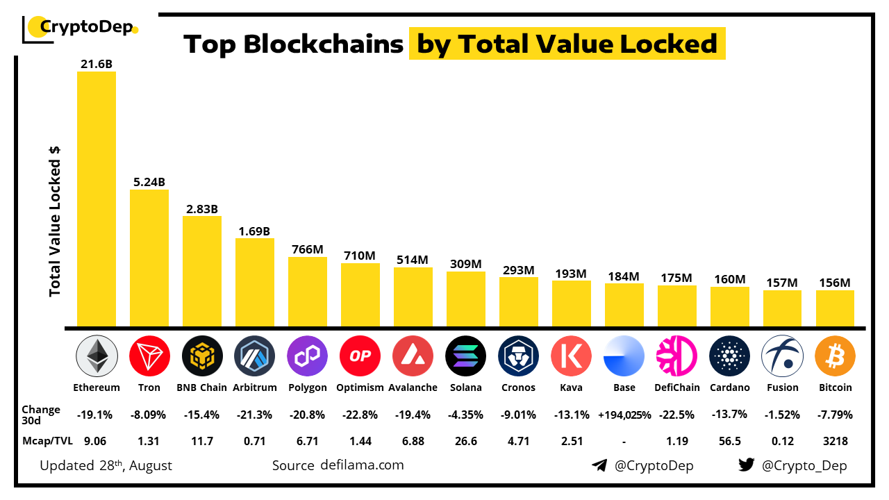 The overall value of crypto assets deposited in blockchain protocols is about $44.5B. Ethereum $ETH, Tron $TRX, BNB Chain $BNB, Arbitrum, and Polygon $MATIC are among the leaders, according to the data from DeFillama.